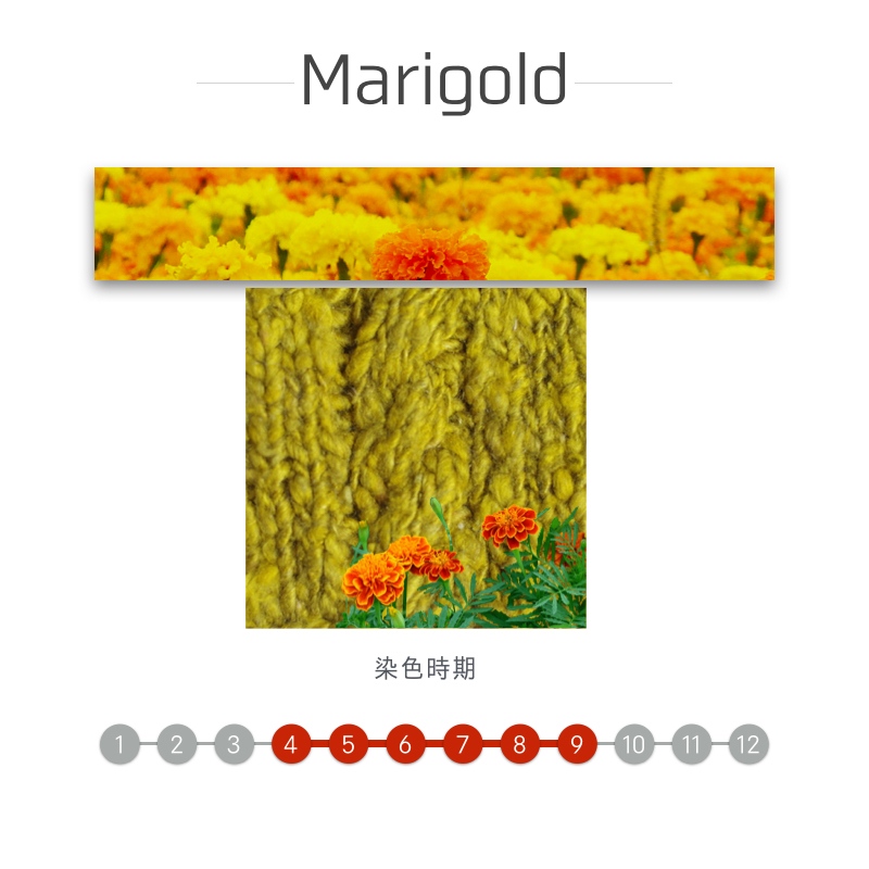 「聖母マリアの黄金の花」の意味を持つマリーゴールド 花言葉は「信頼」、 「勇者」、「生命の輝き」、「変わらぬ愛」マリーゴールドの原産は全てメキシコです。 アフリカン・マリーゴールドは16世紀初頭にスペインに輸入され、 ヨーロッパに帰化していきます。フレンチ・マリーゴールドは、最初パリの庭園に植えられ、 そこからヨーロッパ全域に波及していきました。 日本には江戸時代、寛永年間に渡来していますが自生はしていません。 ドイツのバイエル社がマリーゴールドの花びらから抽出した脂肪酸エステル混合物に高い効果があることを発見し、 ヘレニエンを有効成分とする暗順応改善薬「アダプチノール」が作られました。 この薬は現在でも目の薬として使用されています。 染めるのはフレンチマリーゴールドです。良くに出してから媒染は、無媒染、ミョウバン、銅媒染、黄色~薄い茶色まで染めることが出来ます。